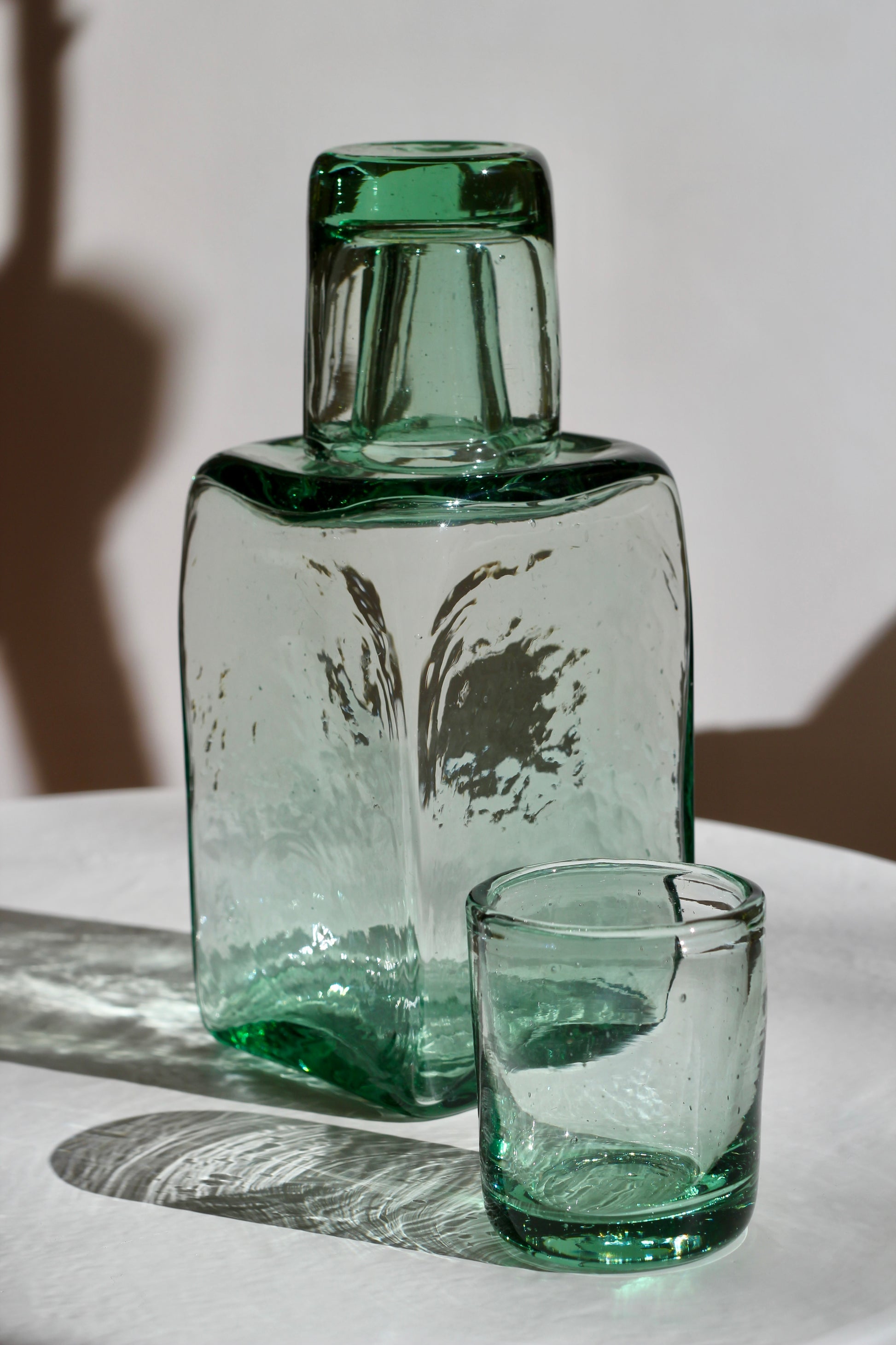 A rustic glass carafe and mini tumblers, perfect for your nightstand or guest room. Tumbler may serve as a lid when not in use. Handmade from recycled, mouth-blown glass by our artisan partners in Bogotá, Colombia.