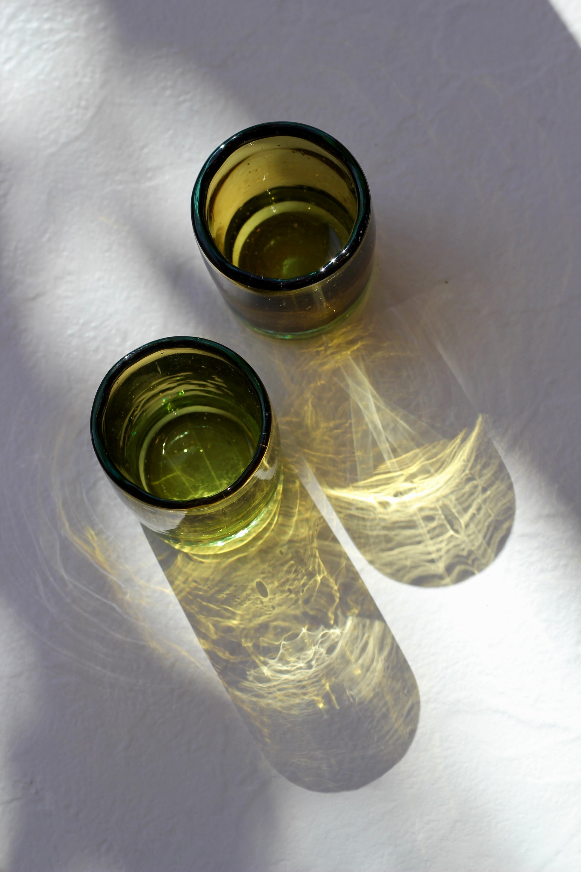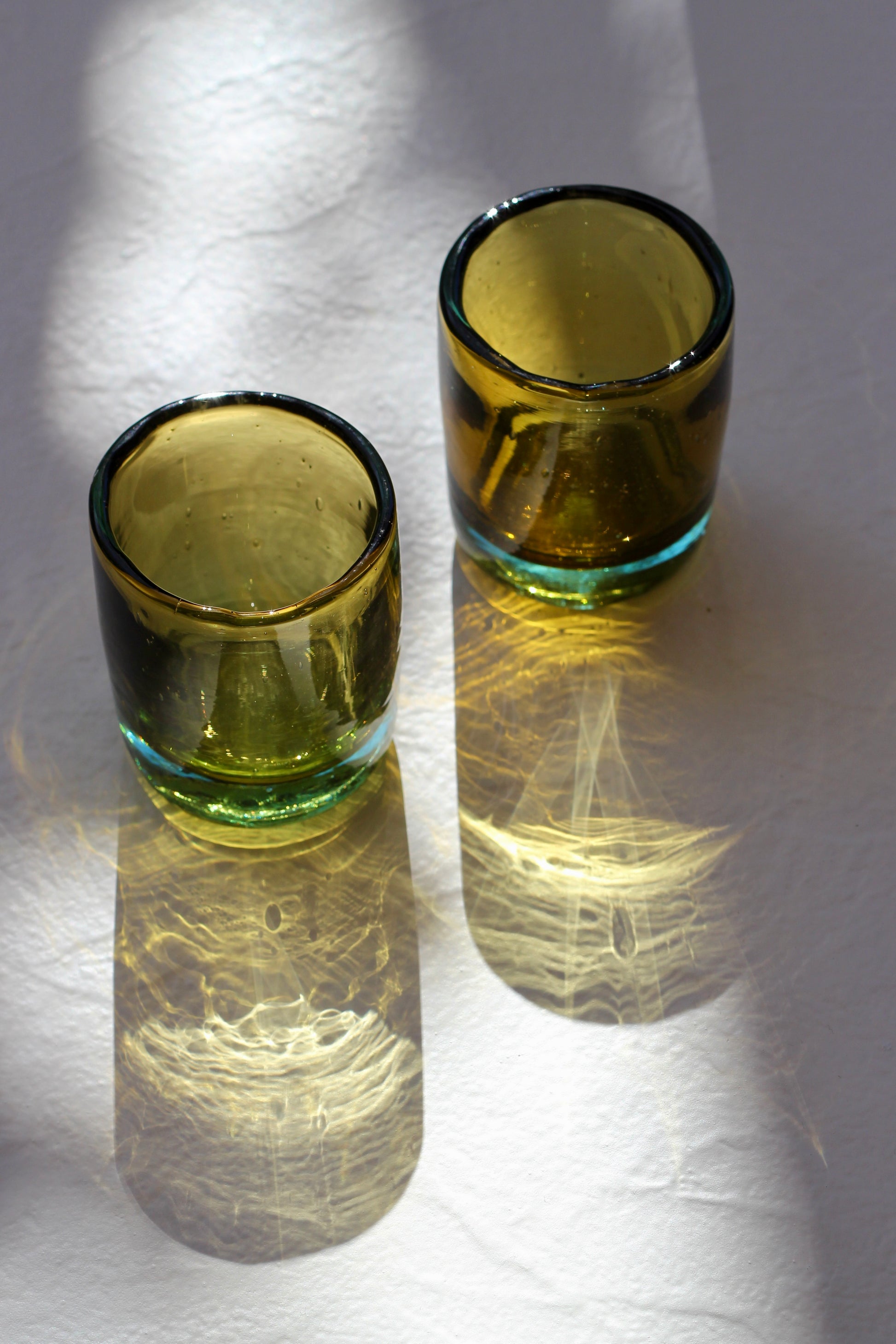 Recycled, mouth-blown glass tumbler set with wavy detailing and an aqua + amber bicolor hue. Handmade in Bogotá, Colombia by Cristal Artesanal.