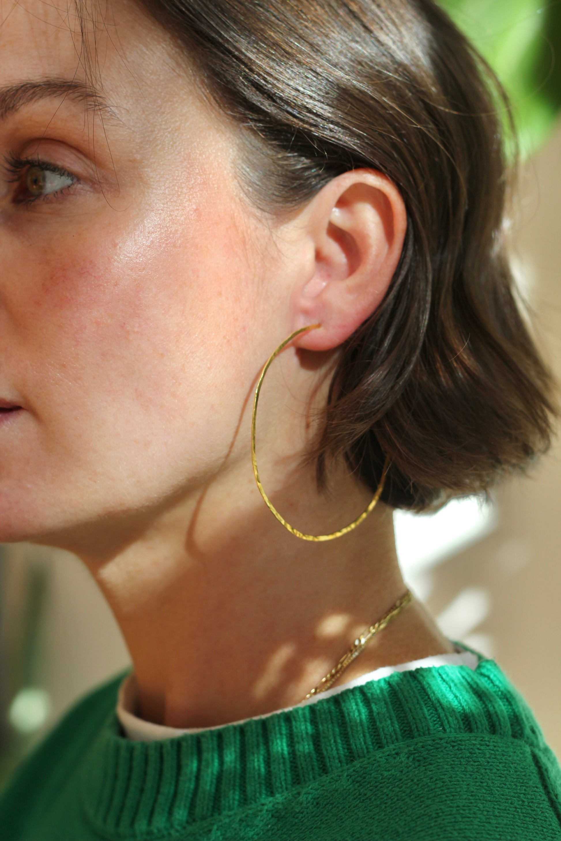Gorgeous and lightweight hammered gold hoops. Perfect for day or night. Made by Helena Aguilar in Medellín, Colombia.